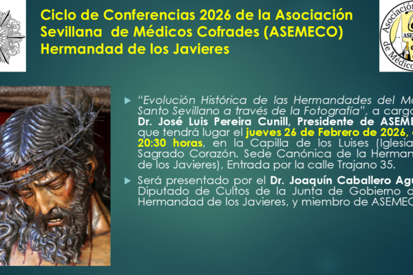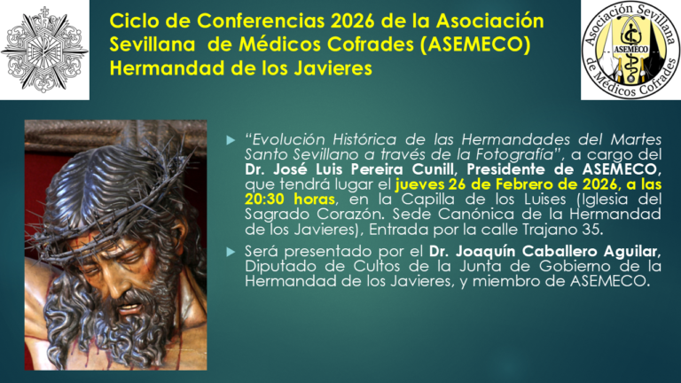 El próximo jueves 26 de Febrero de 2026, a las 20:30, en la Capilla de los Luises de la Sede Canónica de la Hermandad de los Javieres, tendrá lugar la conferencia “Evolución Histórica de las Hermandades del Martes Santo Sevillano a través de la Fotografía”, a cargo de Don José Luis Pereira Cunill, Presidente de…