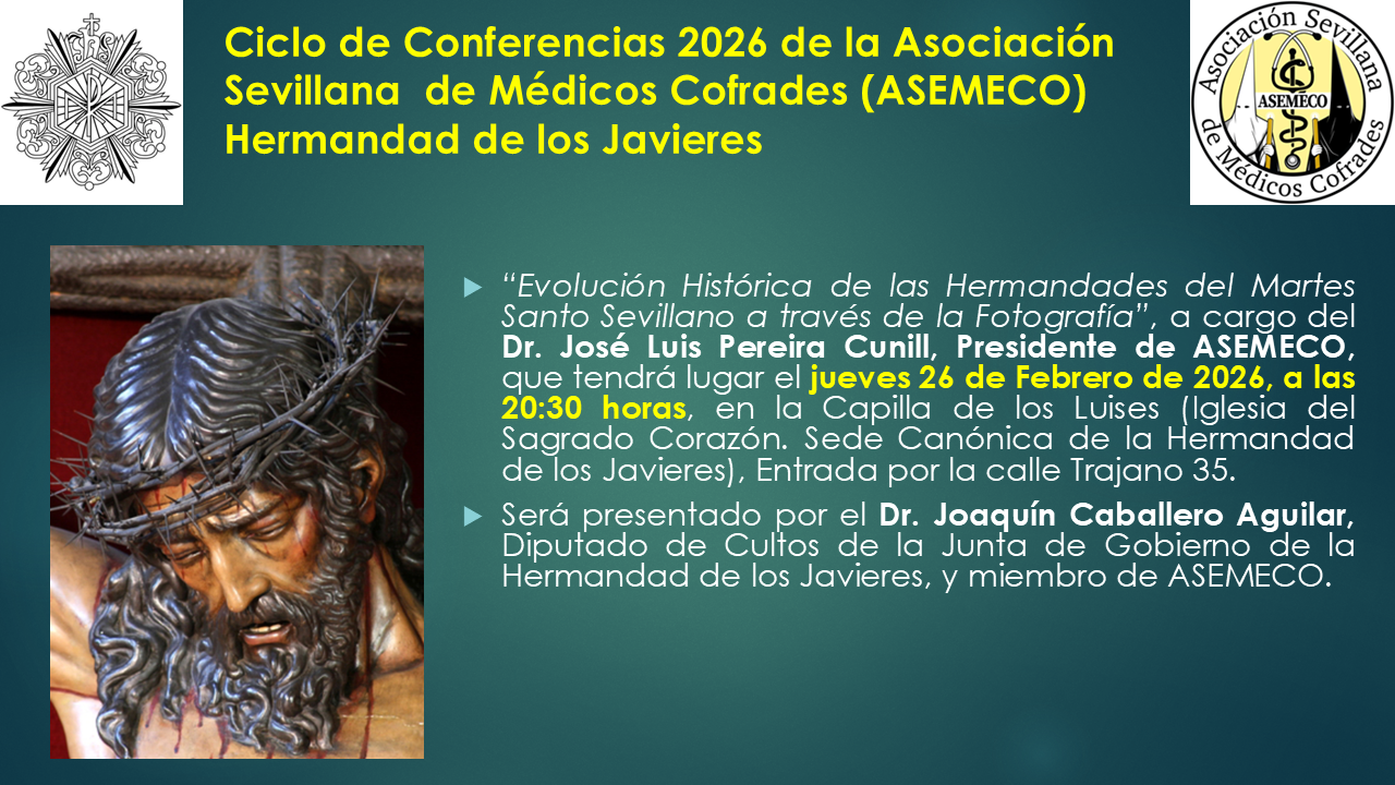 El próximo jueves 26 de Febrero de 2026, a las 20:30, en la Capilla de los Luises de la Sede Canónica de la Hermandad de los Javieres, tendrá lugar la conferencia “Evolución Histórica de las Hermandades del Martes Santo Sevillano a través de la Fotografía”, a cargo de Don José Luis Pereira Cunill, Presidente de la Asociación Sevillana de Médicos Cofrades (ASEMECO). Esta Conferencia está organizada conjuntamente por la Hermandad de los Javieres y por nuestra Asociación ASEMECO.